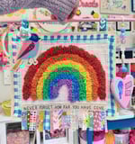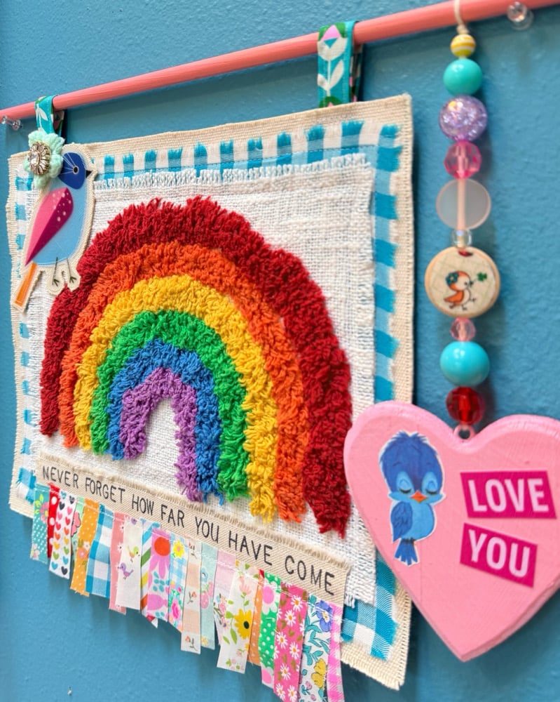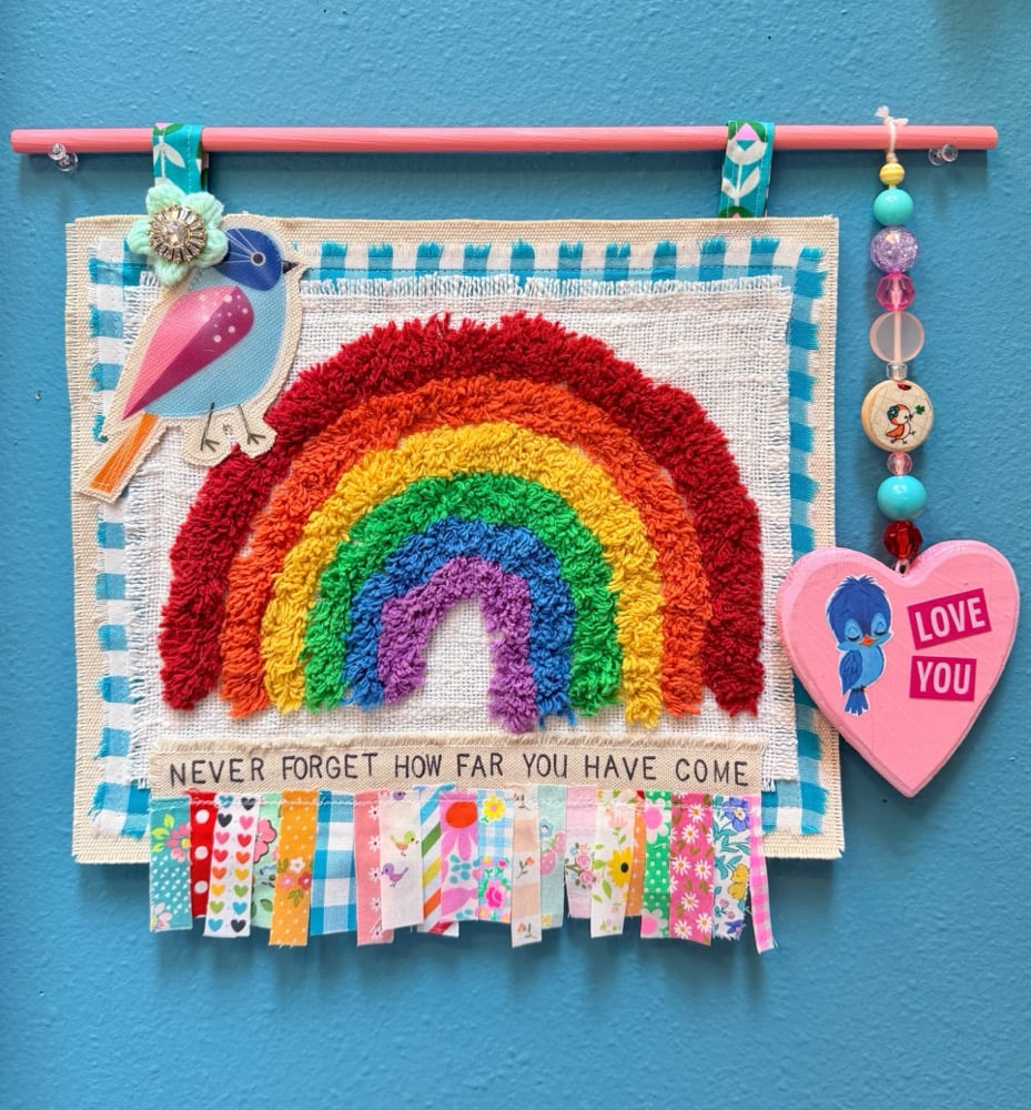 Whimsical and one of a kind mixed media art piece. Made with little scraps of fabric, a shaggy rainbow, handmade beads and much more….lots of details to admire! Handmade with lots of love ❤️ Measures approx 16.5x14 inches and ready to ship!
