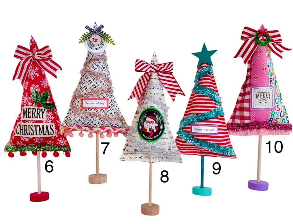 Hello holiday 2025🎄Each tree is unique and one of a kind, ready to adorn your home with holiday joy…the charm & cheer is hard to capture in a photo! Made with a variety of fabrics, ribbons, trinkets and more🎄Each tree measures between 10-15 inches - choose your favorite from the "numbered tree" menu🎄