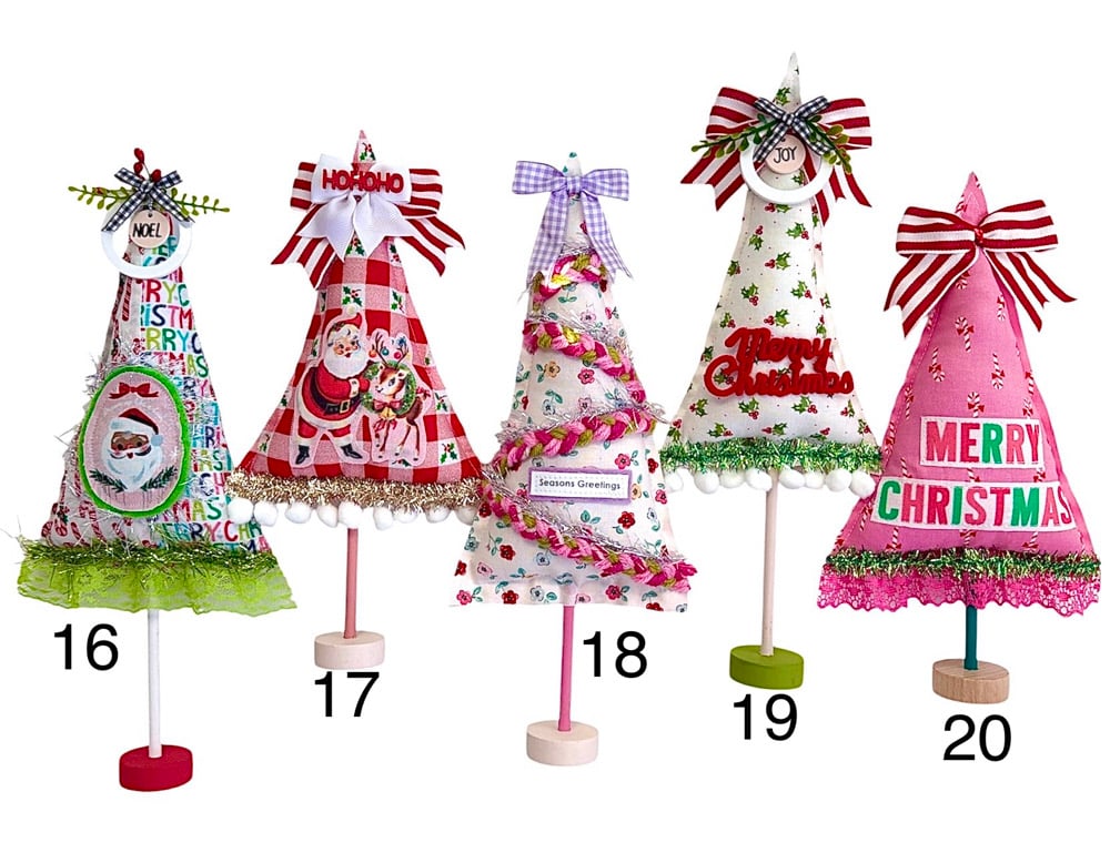 Hello holiday 2025🎄Each tree is unique and one of a kind, ready to adorn your home with holiday joy…the charm & cheer is hard to capture in a photo! Made with a variety of fabrics, ribbons, trinkets and more🎄Each tree measures between 10-15 inches - choose your favorite from the "numbered tree" menu🎄