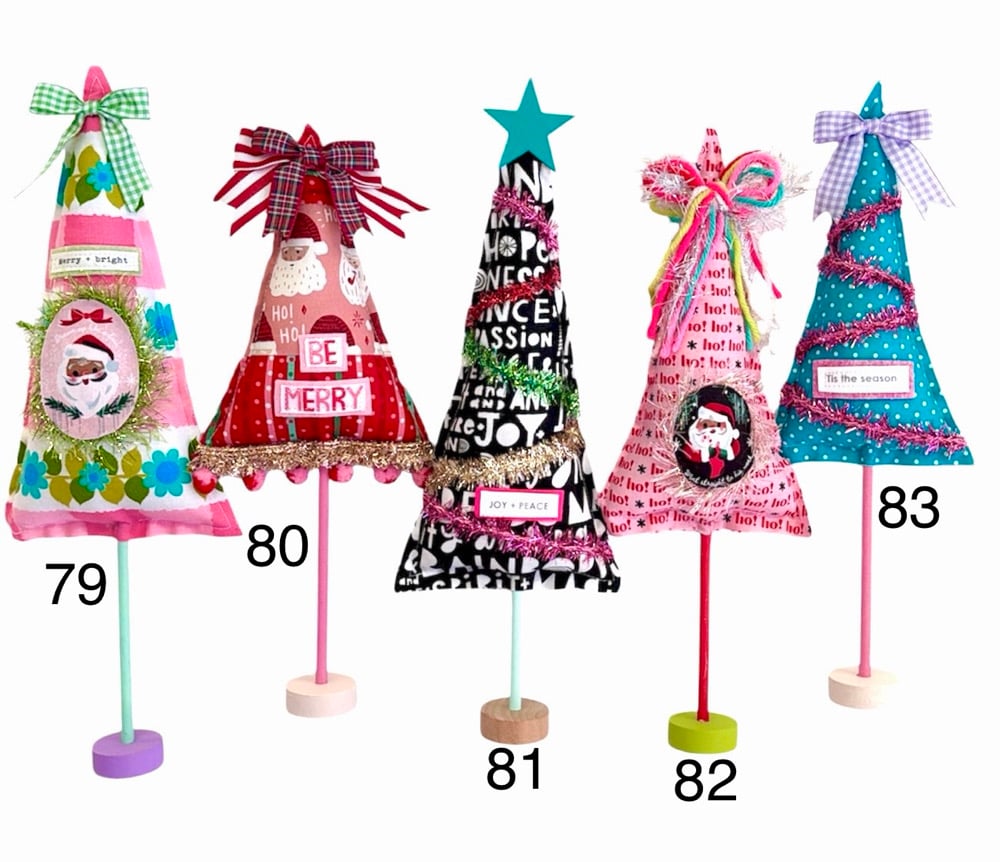 Hello holiday 2025🎄Each tree is unique and one of a kind, ready to adorn your home with holiday joy…the charm & cheer is hard to capture in a photo! Made with a variety of fabrics, ribbons, trinkets and more🎄Each tree measures between 10-15 inches - choose your favorite from the "numbered tree" menu🎄