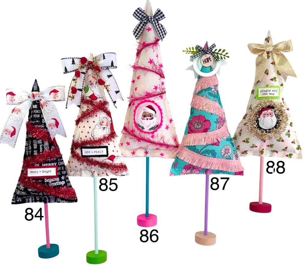 Hello holiday 2025🎄Each tree is unique and one of a kind, ready to adorn your home with holiday joy…the charm & cheer is hard to capture in a photo! Made with a variety of fabrics, ribbons, trinkets and more🎄Each tree measures between 10-15 inches - choose your favorite from the "numbered tree" menu🎄